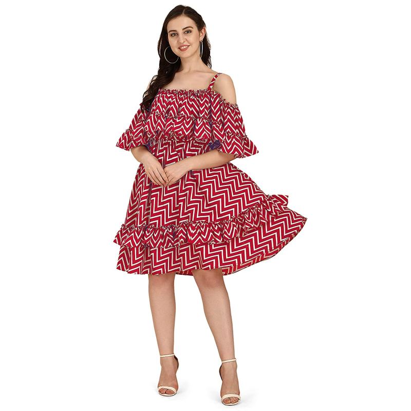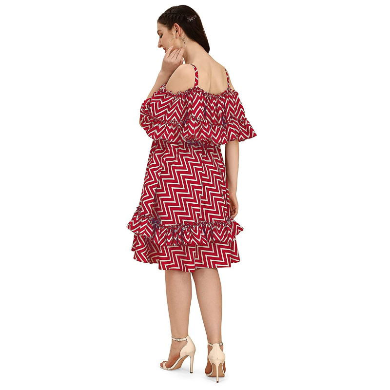 • فستان بطيات مرح مع كشكش على الحافة. فتحة رقبة مكشوفة على الكتف، مع حمالات نودلز وكاب كشكش