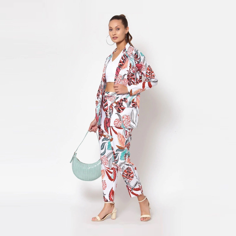 بليزر أبيض مطبوع بالورود بصدر واحد، بياقة طية صدر مسننة، أكمام قصيرة