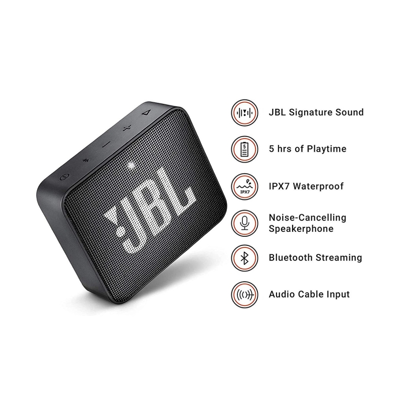 The JBL GO 2 is a full-featured waterproof Bluetooth speaker to take with you everywhere. Wirelessly stream music via Bluetooth for up to 5 hours of continuous JBL quality sound. Making a splash with its new IPX7 waterproof design, GO 2 gives music lovers the opportunity to bring their speaker poolside, or to the beach. GO 2 also offers crystal clear phone call experience with its built-in noise-cancelling speakerphone. Crafted in a compact design with 12 eye-catching colors to choose from, GO 2 instantly raises your style profile to all-new levels.