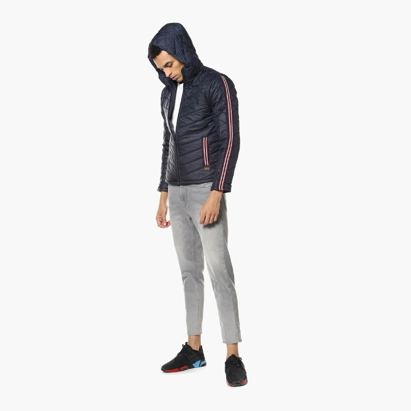 The Navy blue geometric self-design windcheater quilted jacket, has a hood, 2 pockets, a zip closure, long sleeves, a straight hemline, and polyester lining.